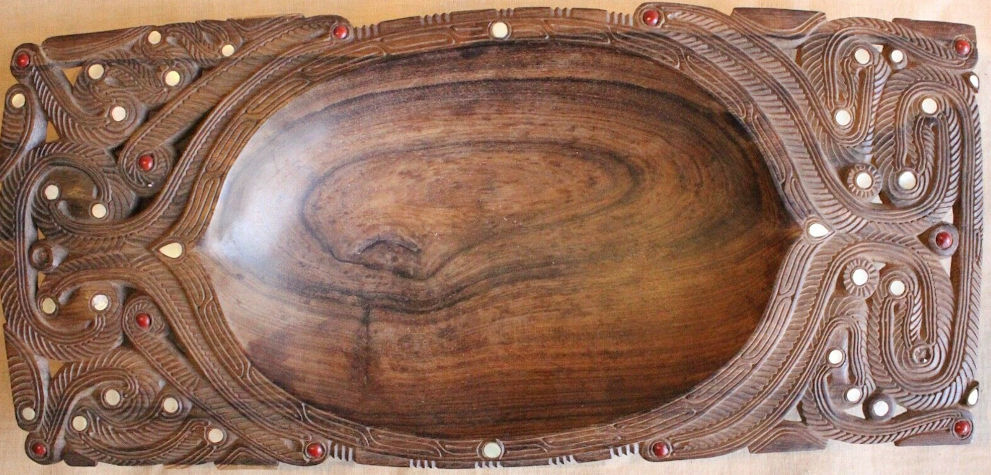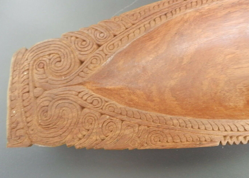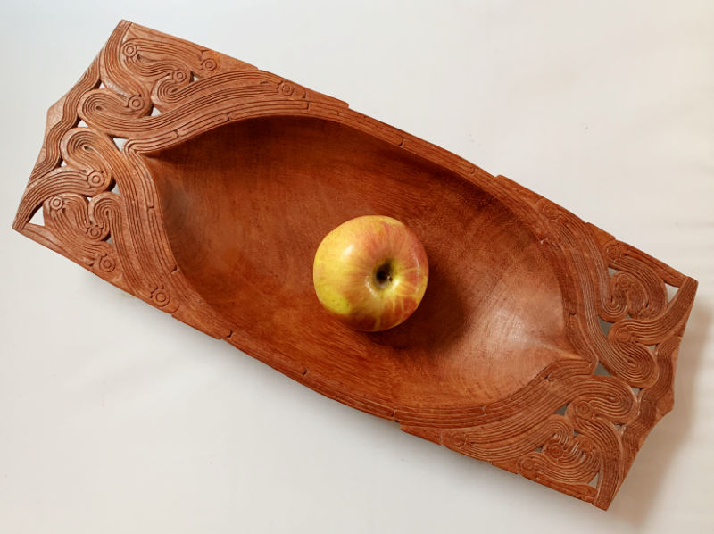 So I started researching online and I just wasn’t finding similar items at first. You know how it is. Then you tinker with different search words. Eventually I found some wood trays from Papua New Guinea that were so similar–from the shape of the bowl to the carving style to the small indents at the top and bottom of the bowl. Bingo!