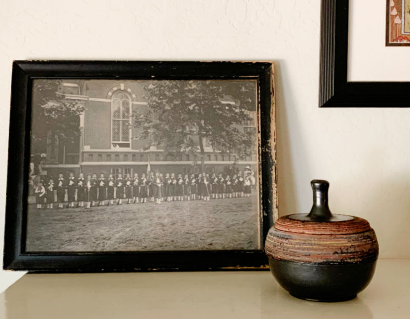 Then I started thinking about the dark, moodier things I have. I pulled out a fabulous antique photo of military school boys and then added the 1961 pottery jar by Baba. You know the Baba who lived in Haight Ashbury, loved shrooms and free love. Okay, I made that part up! But I love how simpatico they are.