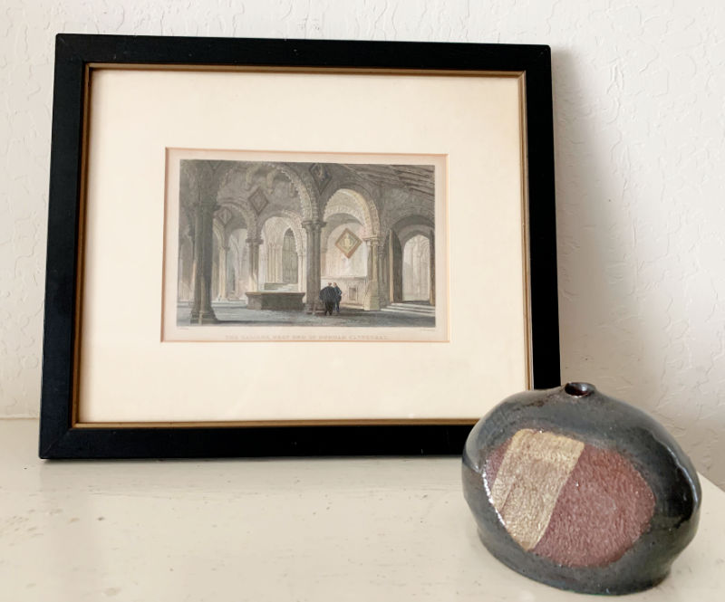 Then I added the antique Durham Cathedral engraving I recently bought with another mid-century modern pottery piece dated 1966. The colors on the vase echo those in the engraving.
