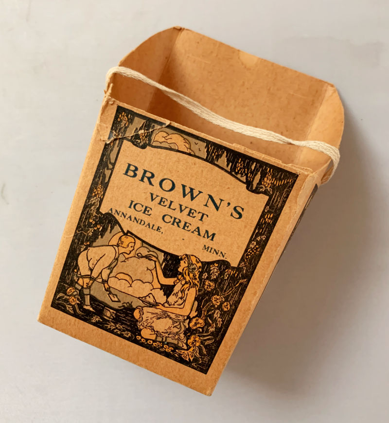 This 1929 paper ice cream box hales from “Brown’s Velvet Ice Cream” in Annandale, Minn! How this has survived all these years astounds me. There is one repair, but otherwise it is quite lovely with its charming Art Nouveau illustrations all the way around. This is not my normal type of item, but people do buy and collect this sort of thing.