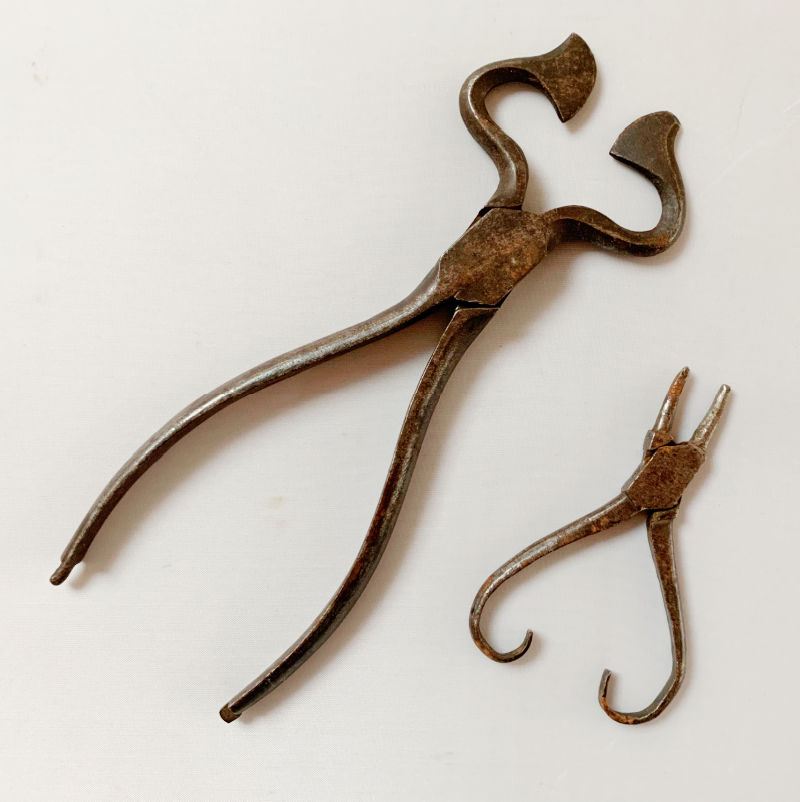 These wrought-iron pieces are old. Antique old. The larger pair are sugar cutters or nippers back in the day when sugar was sold in loaves. The smaller pair appear to be rather cute pliers! I may just keep the pliers.