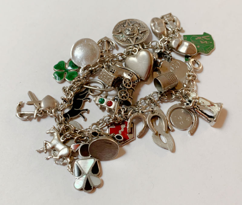 But this MCM loaded charm bracelet would be a fabulous extravagant gift. I bought it over a year ago to dismantle, but ended up wearing it instead. Finally I decided it was time to list it but didn’t have the heart to break it all up. Love the enameled bride and groom charm. (Listed for $175.)