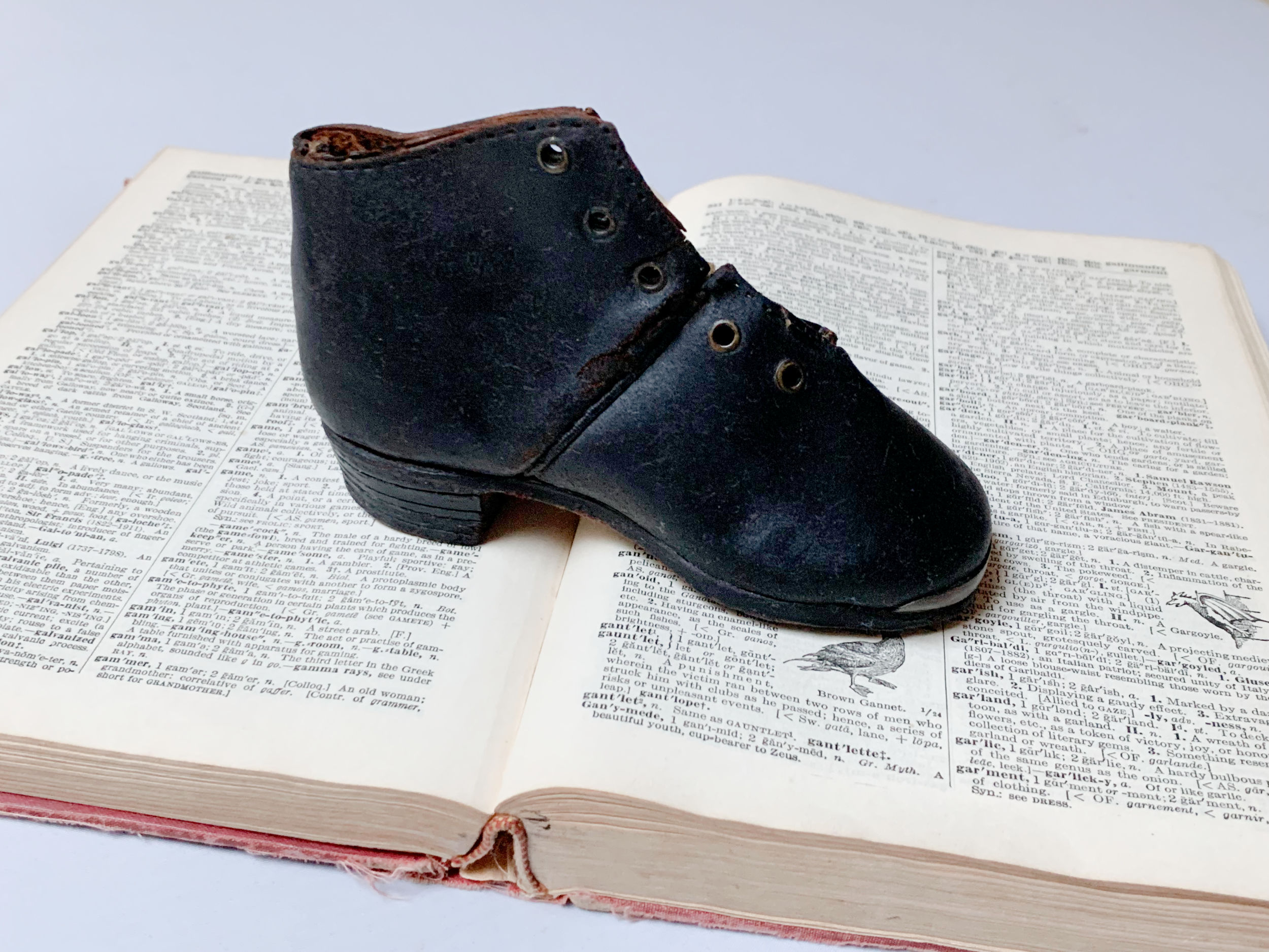 So today with the clouds and rain it was the perfect day to stay in and focus on listing items in my Etsy store and that’s precisely what I did all morning. I figure it’s the best use of my time during this holiday buying season…though honestly some of my offerings are a tad quirky and I’m not sure about their “gift-ability!” Like this worn/ripped baby shoe from the 1850s (dated on the brass toe bumper) that I bought recently in North Carolina. Will anyone want to give this a home? (My husband thinks not!) I think it would look adorable with a little bottle brush Christmas tree poking out of it. And consider…how many 170-year-old shoes are still around??! (Listed for $25.)