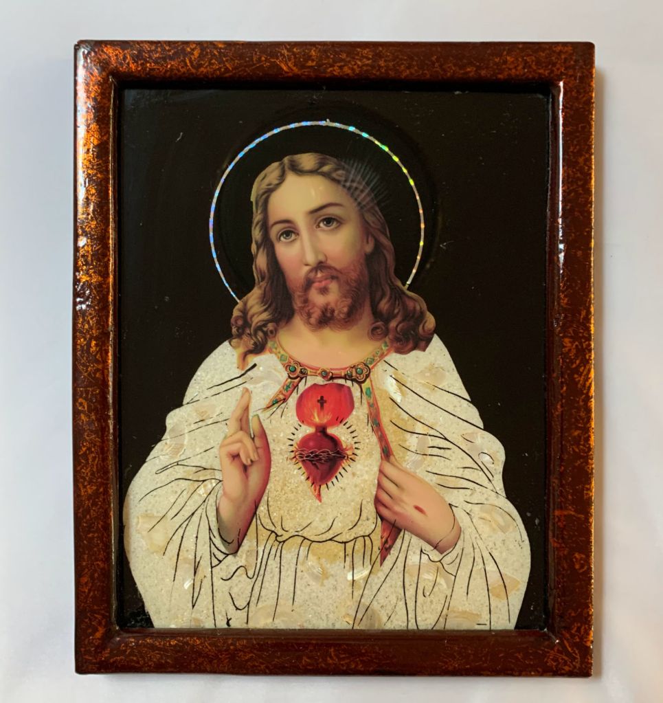 I did pop into my neighborhood thrift store today–just for a quick rummage–and I came up with the most amazing, handmade, (slightly) tacky Sacred Heart of Jesus. It has decoupaged bits (head, hands and heart), a gown of some material with random bits of shell and hand-painted folds and an iridescent halo. I mean honestly…I could not leave this behind! Even the frame was over the top.