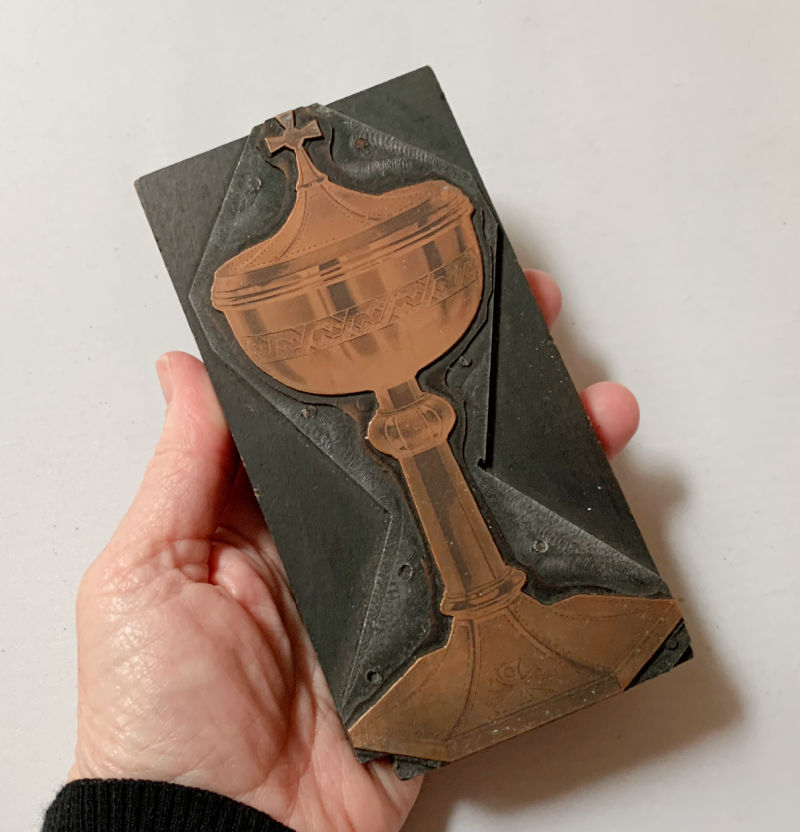 I also added this fabulous detailed printer’s block of a ciborium (used to hold communion wafers). It displays beautifully and would look great on a personal altar. (Maybe I should keep this one!!)