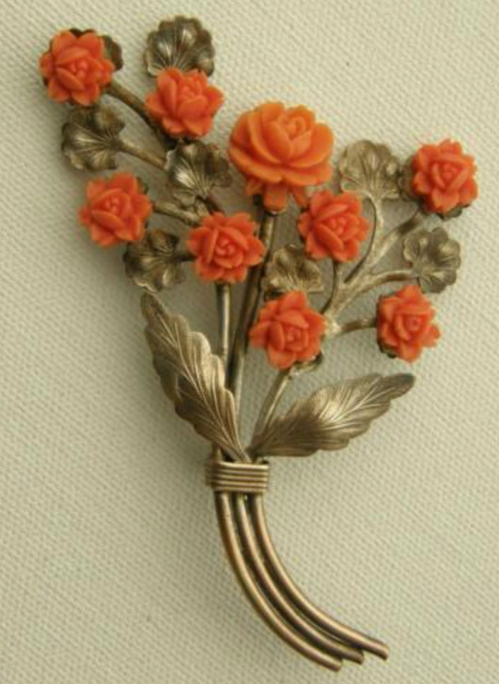 At one seller’s table I looked at an unmarked, unsigned gold-tone pin with carved coral roses (unknown if real or faux coral) somewhat similar to this one found on eBay. It wasn’t a spectacular piece, but a bit of 1950s costume jewelry fun. I was expecting a flea market price of $5 to $8. When the seller said he wanted $40 I thought “Good luck with that.” I didn’t stay any longer at his table looking at other pieces because I knew it would be pointless.