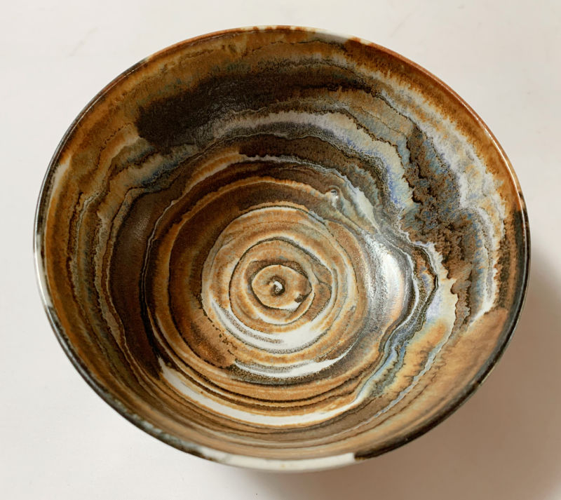 Here’s my bowl paired with my new find. He glazes them with agate-like stripes.