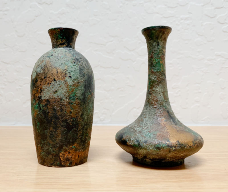 I LOVE these mini oxidized verdigris bronze vases–both for their texture and the beauty of the finish. Turns out they were likely made in Japan. Possibly mid-century, but it’s hard to know for certain. Some slightly bigger ones are listed as antiques. But I am not confident in saying that about mine. Still they are beautiful and I may keep the “genie bottle” one for myself for a while.
