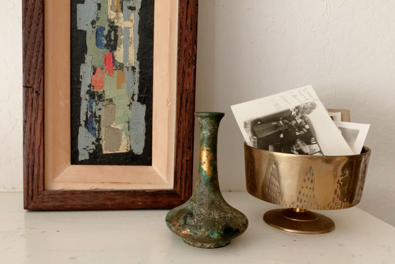 I added one to a mantel display and thought it looked great with my mid-century modern abstract painting by Helen Lustgarten and my vintage Korean brass pedastal bowl.