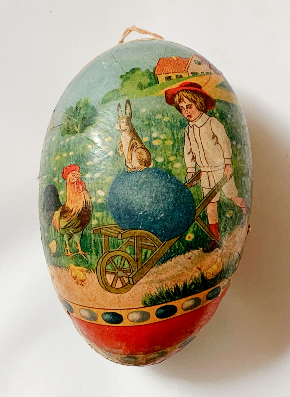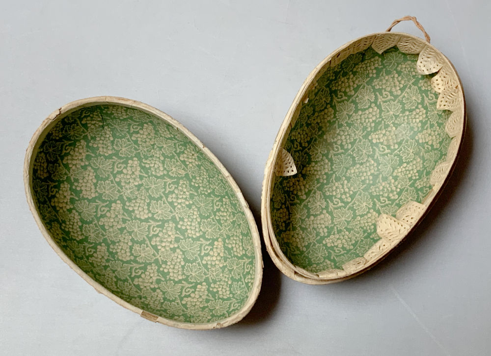 I got slightly giddy when I spotted this antique papier-mâché Easter egg for a snip. Likely German, though I know nothing about these! Turns out that lace bit around it is known as “Dresden trim.” Listed for $75.