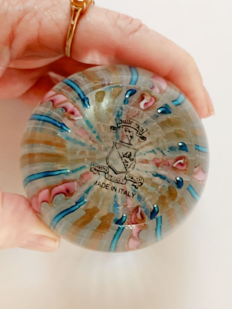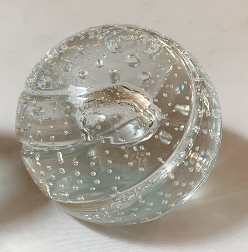 The clear paperweight with controlled bubbles is a Caithness Scotland piece in their Whirlygig pattern.