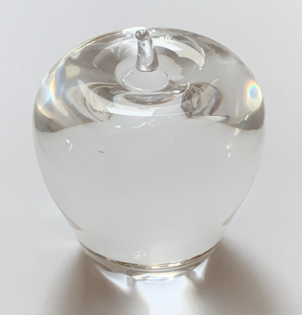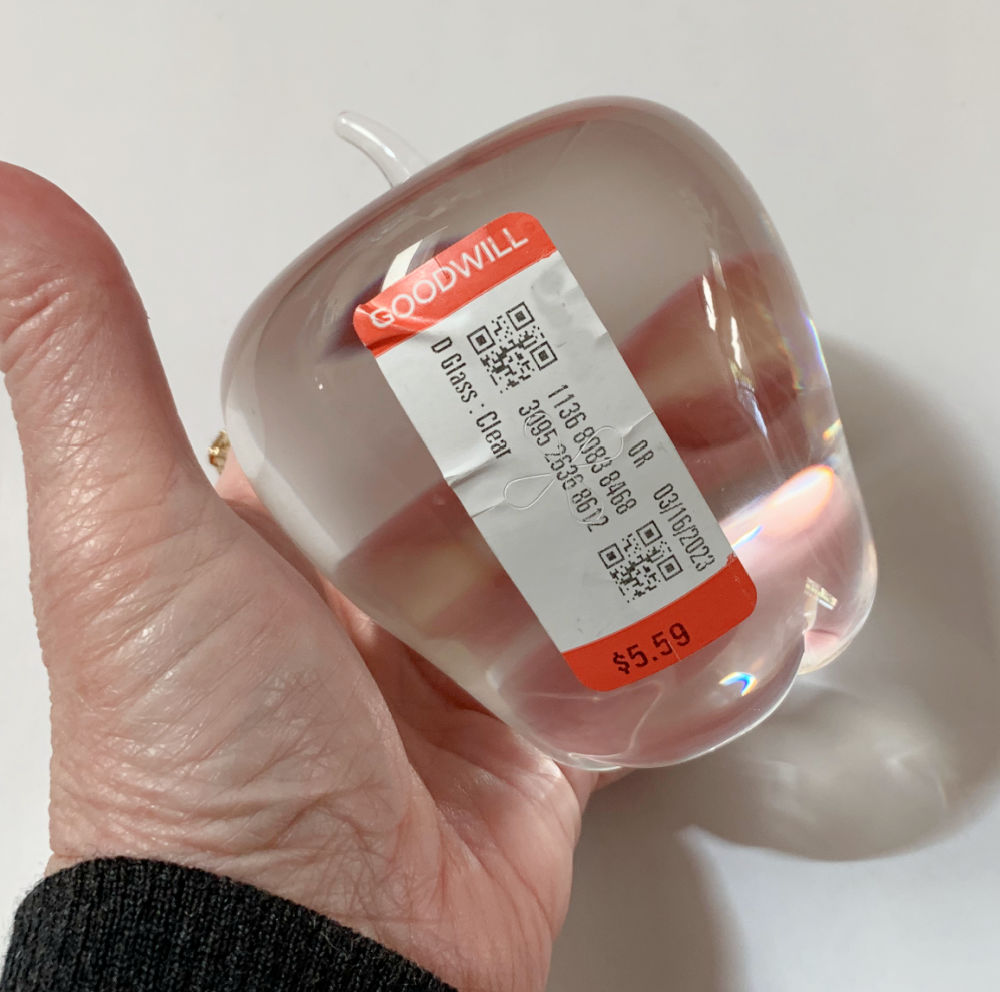 So I was all set to walk out empty handed, again, and then I spotted a glass apple on my third time down the clear glass aisle. Hmmm. Okay a glass apple. Kinda cool. I picked it up. Gosh it was super heavy, felt good in the hand and was beautifully clear.