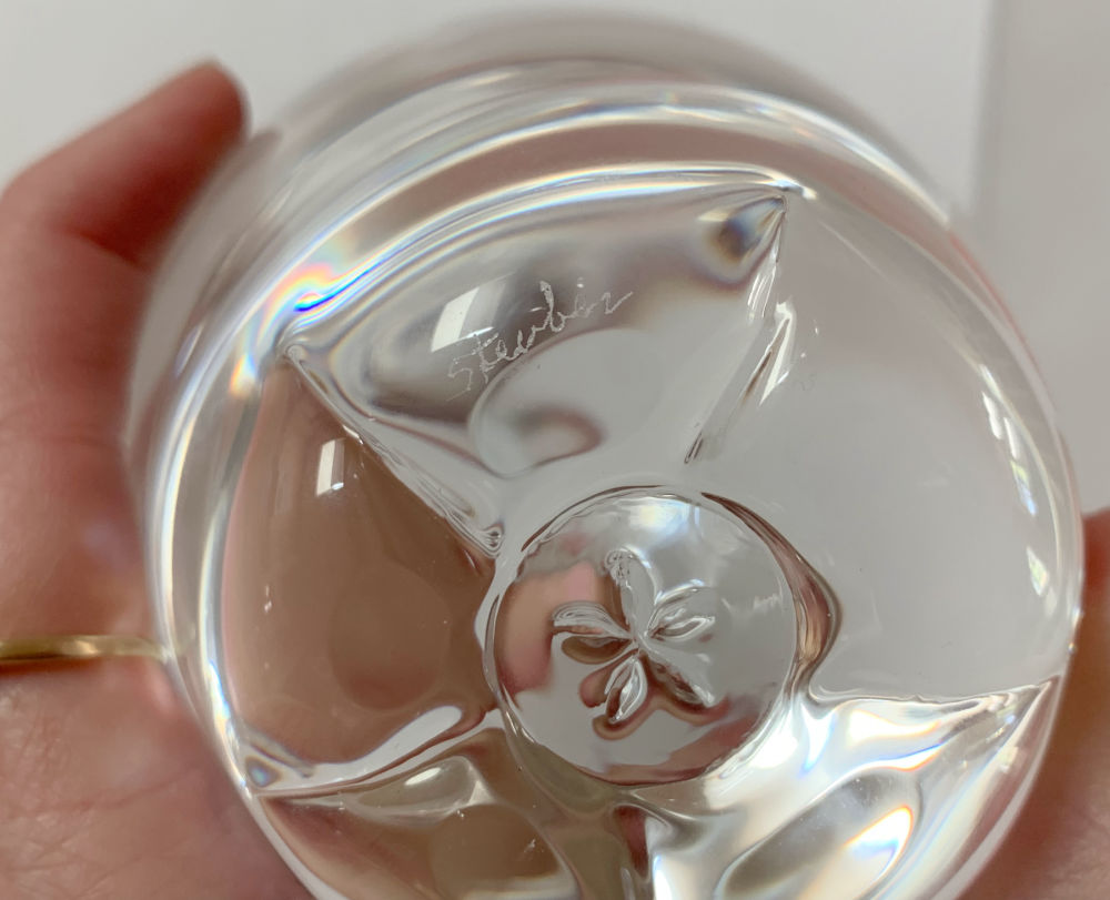 I flipped it over and found an acid-etched maker’s mark for Steuben. Holy smokes!!! Steuben glass. This was good. Really good.