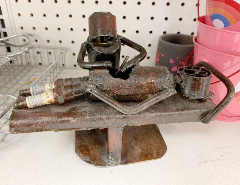 Buying quirky things is another of my 2023 buying strategies and I thought this metal/spark plug folk art operation piece was great fun. But I wondered how long he would take to sell. And at $11 plus change, I decided to pass it by. (I would have bought it at $5 or less.)