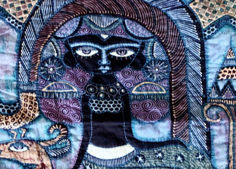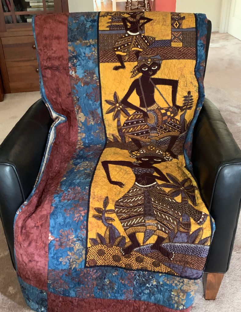On the fabric/towel/linen shelves I spotted a number of folded up quilts. (Usually they hang them up so that was curious.) I started opening them up and realized two things: they were all in like-new condition and all hand quilted!! I choose two that I found most intriguing. Both have figures which turn out to be Indonesian! The figural fabric pieces set in the cotton quilts are Jaka batik prints.