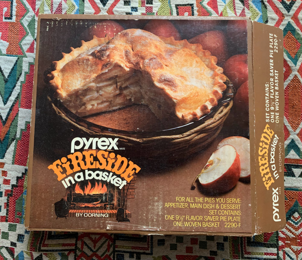 Well, irregardless, I got started. First in our kitchen I pulled out random bits…a refrigerator container for a fridge we no longer own, some canning jars I don’t use and this Pyrex pie dish in a basket. This was a wedding present from a zillion years ago and to be honest I’ve only used it two or three times in all these decades. Can’t believe I’ve held onto it this long!