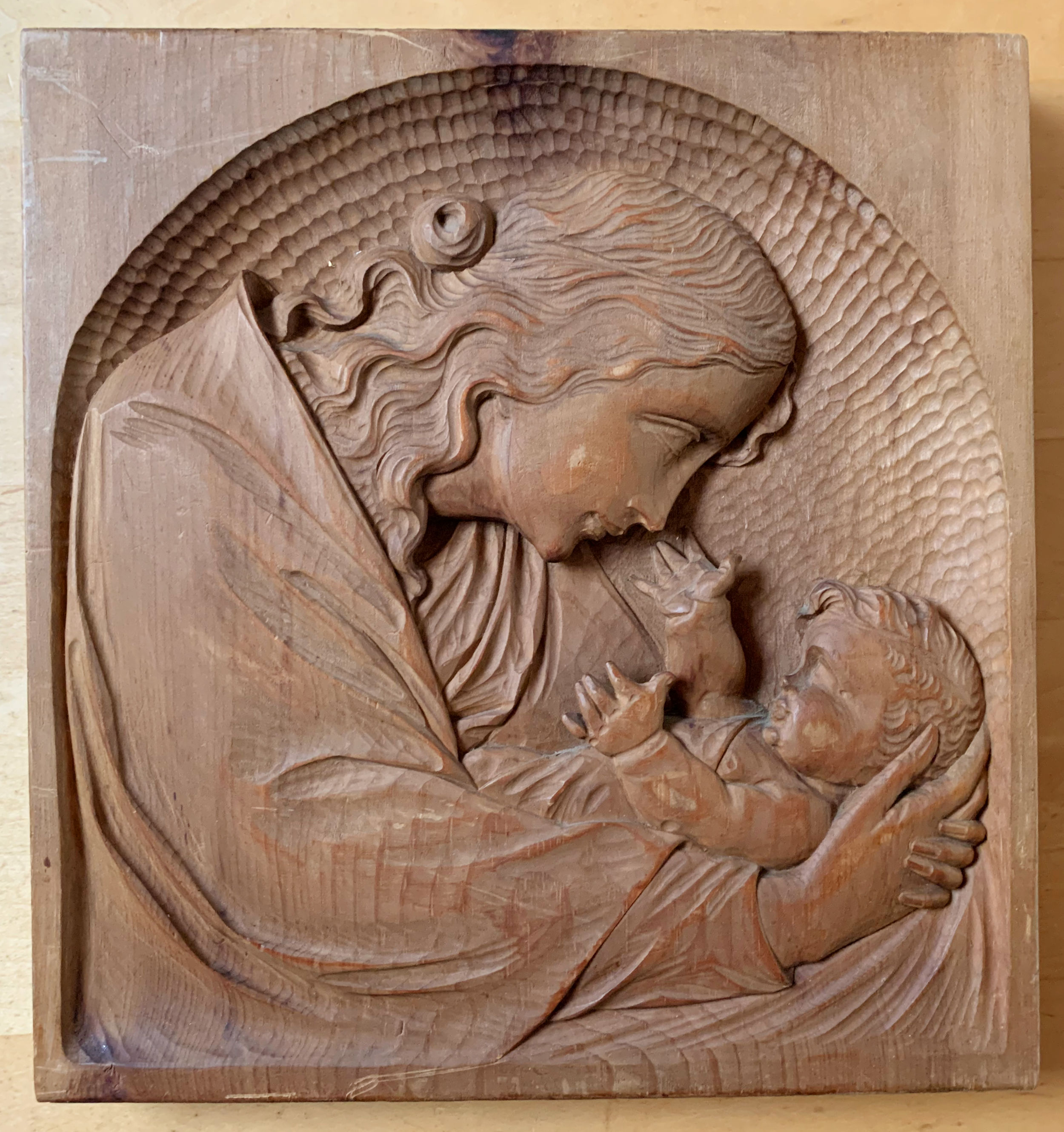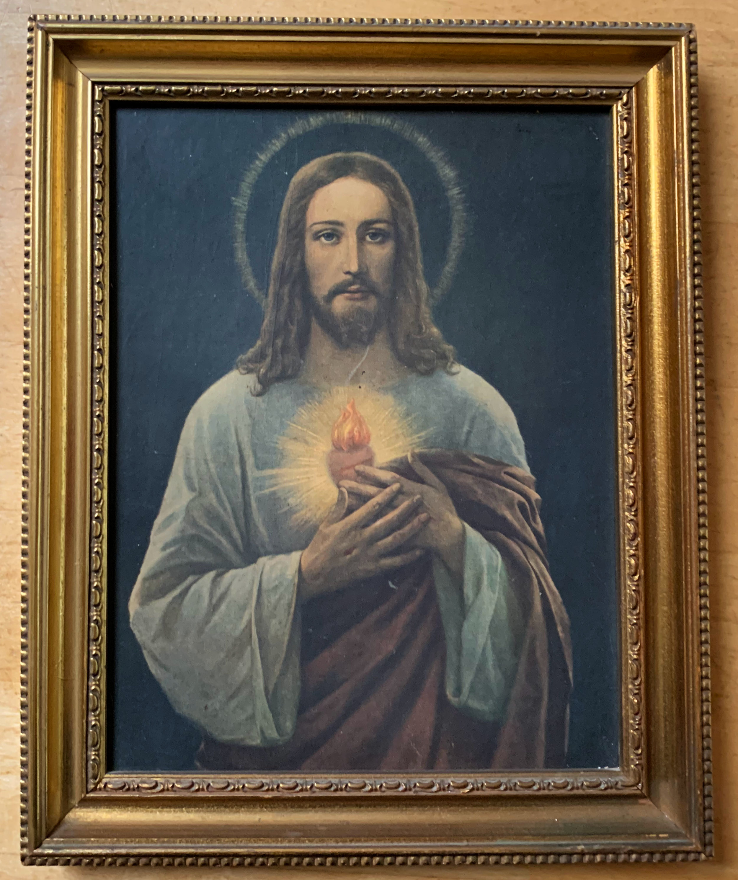 The wood carving of Mary and Jesus is just so beautifully done and would appeal to any mother. The Sacred Heart of Jesus print is an old lacquered one in an old frame, circa 1930s to 1950s. Neither of these brought up exact images in Google Lens.