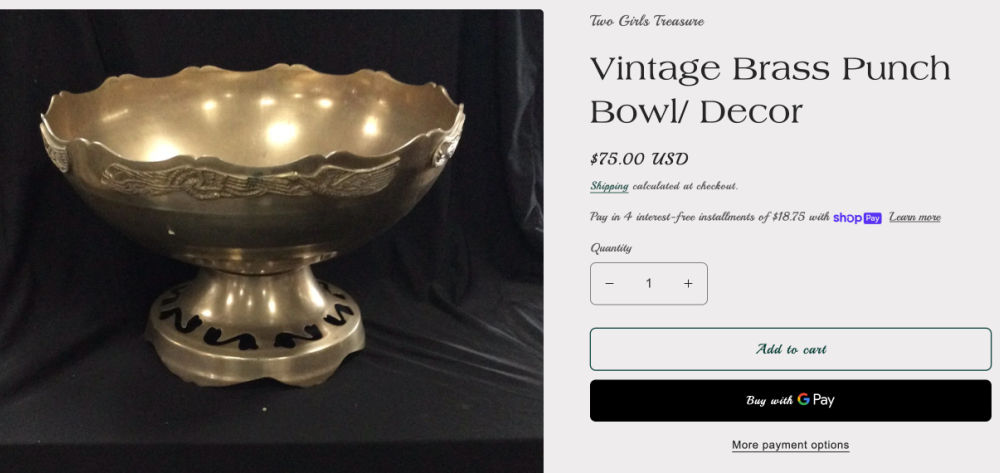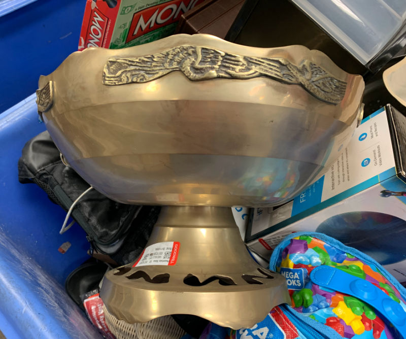 The next day I headed to the Goodwill down the road and was tempted by this huge brass punch bowl (for $9.99) still in a new merch bin. But I just didn’t like the design! The cutouts on the base were unappealing and I couldn’t figure out what the applied design bits around the top were. (Turns out they’re flying cranes.) In the end I left it behind.