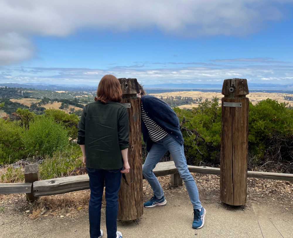 We started our little trip grabbing a bite at my husband’s workplace. I had gourmet trout, grilled asparagus, roasted carrots, lavender shortbread cookies. Not your typical cafeteria food! Up at the park, the clouds were just starting to burn off. Looking northward you could see San Francisco in the hazy distance.