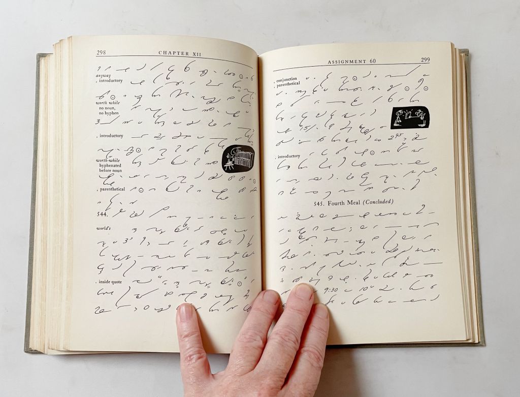 And I finally decided it was time to let my aunt’s 1950s shorthand textbook (“Gregg’s Advanced Dictation Simplified”) go. She was a secretary, then later executive assistant, for 40 years. I love that it belonged to her, but it’s not a book I’ll ever use or look at. I have other things from her estate that are much more meaningful.