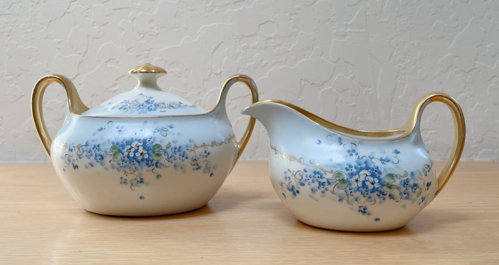 This Z.S. & Co. (Zeh, Scherzer & Co.) Bavaria hand-painted porcelain sugar and creamer set is one I would have normally walked past. In fact all day long I walk past “sweet” stuff like this, but this duo was so fresh in blue and cream and in fabulous condition. And it was sale day. Well, okay, how could I resist? [Turns out it was a bit better than I thought. The company mark on the bottom dates it to 1880 – 1918!]