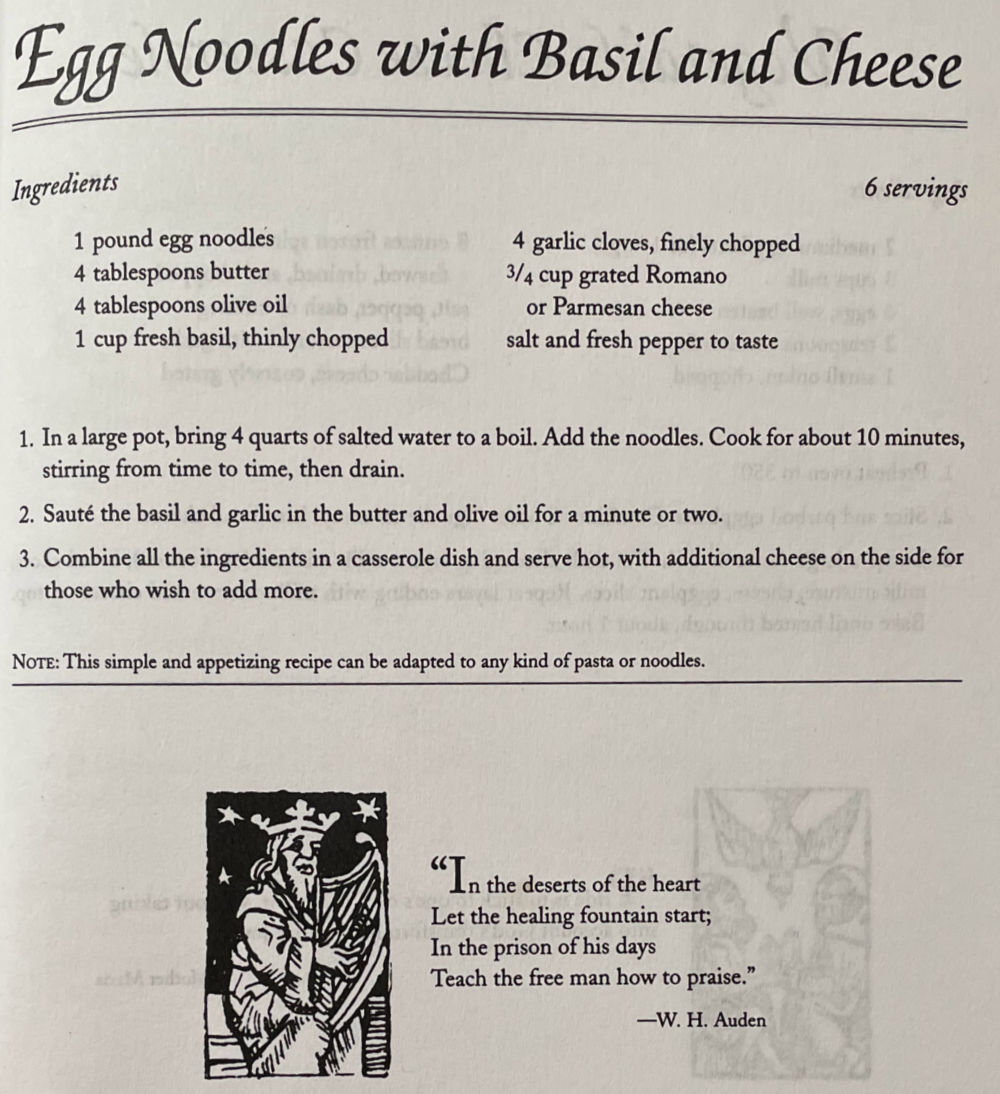Summer finally arrived in Silicon Valley and temperatures shot up…for a bit! I am never too hungry when it’s hot so I decided one night it was a perfect time to make this quick basil pasta. This delish recipe is from my favorite monastery cookbook that features good, simple food.