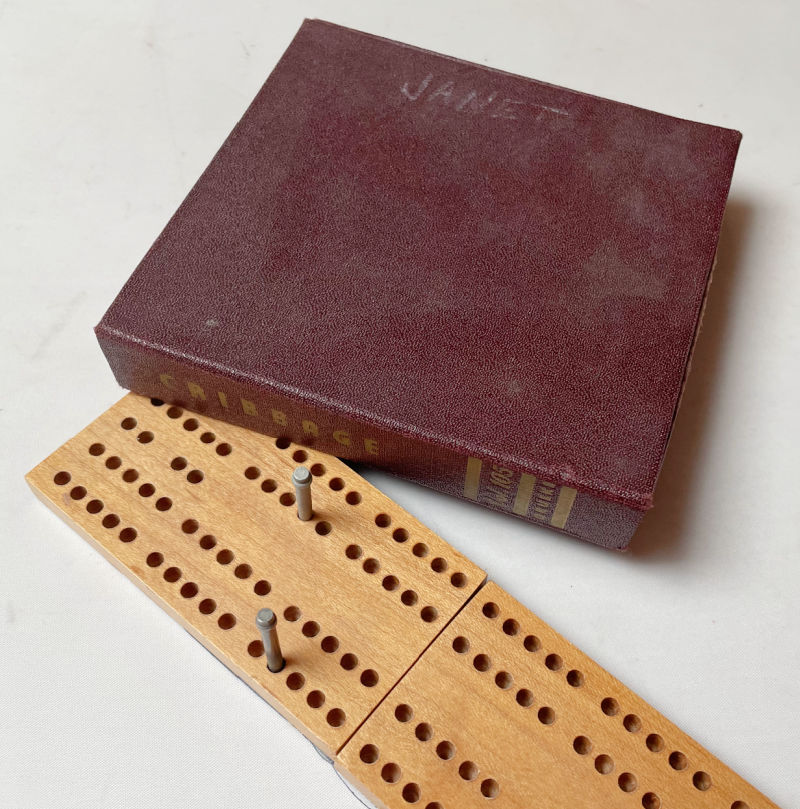 I took a brand new pair of her sneakers that were in my size. (Wore them for three years and always called them my “Aunt Janet sneakers.”) And a little travel cribbage game because she’d made a point of saying years earlier that she wanted to make sure one of “us kids” took when she died. I took a couple of her 1950s secretarial training books, three of my uncle’s 1950s fedoras and various pieces of jewelry.