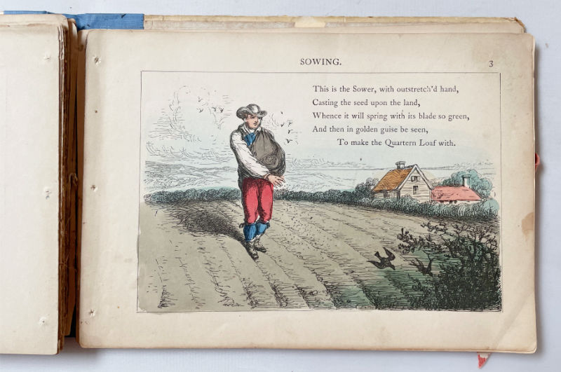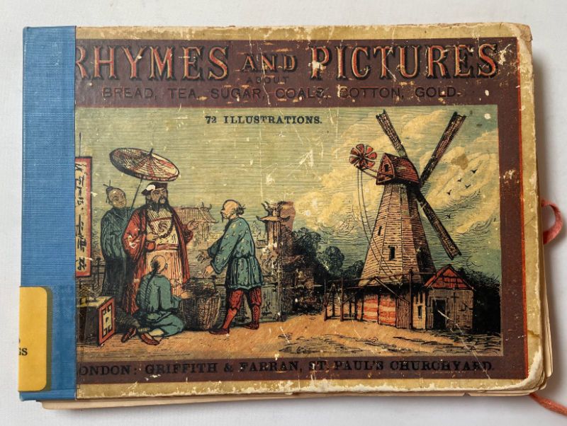 I thought this 1860s “Rhymes and Pictures about Bread, Tea, Sugar, Coal, Cotton, Gold” book (credited to William Newman) was so interesting. This is an ex-library children’s book with almost all the pages separated from the string binding, but these hand-colored engravings are perfect for framing. I’m not sure if I’ll see this as a whole book or split the pages into lots. Likely the later as the book is beyond salvation!