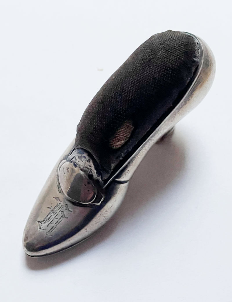Pincushions like this, figural sterling silver pieces, were popular in the late 1800s/early 1900s and included shoes, chicks, pigs, elephants, dogs, canoes, chairs, and on and on. Prices and desirability vary. Certain English silversmiths tend to command higher prices, Sampson Mordan being one. There are newer reproductions available but they tend to lack the fine detail of the older pieces and of course the lovely patina.