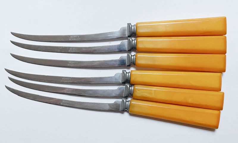 In the last antique store I visited back East, I bought this set of six Henry’s knives (circa 1930s-1940s) with bakelite handles. My research is showing these were intended for cutting tomatoes, but I think these would be great for cheese and would look handsome on a cheese board. I’ll likely split these into several lots. At 20% off, I should make a modest profit.