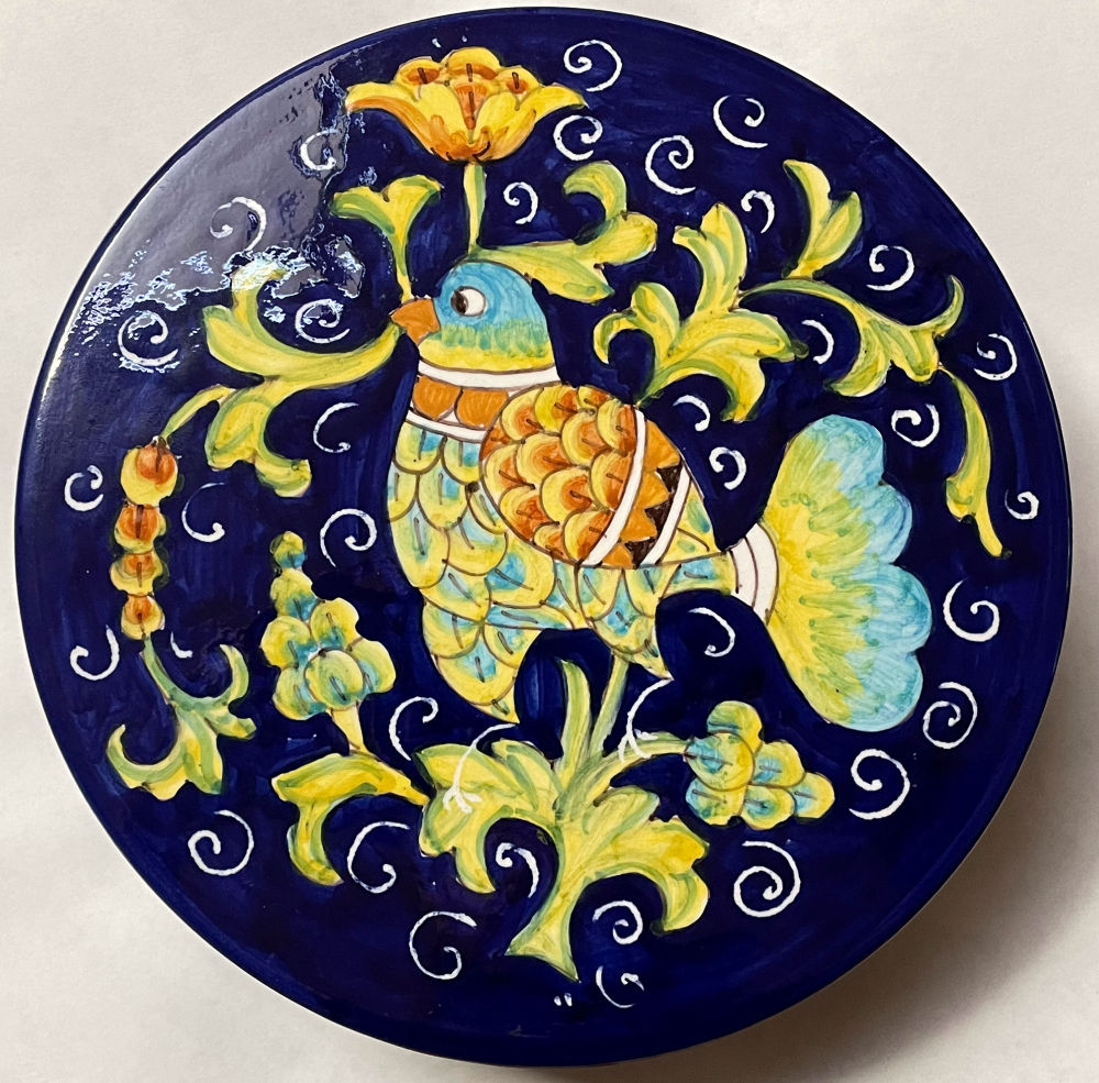 Italian Deruta pottery pieces are desirable, but I’ve had mixed results selling them. Still I thought this majolica round bird box was fun. It’s bigger than the usual trinket box at 7″ diameter but has a great graphic appeal.