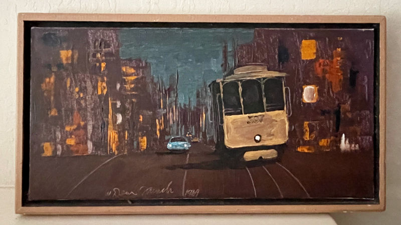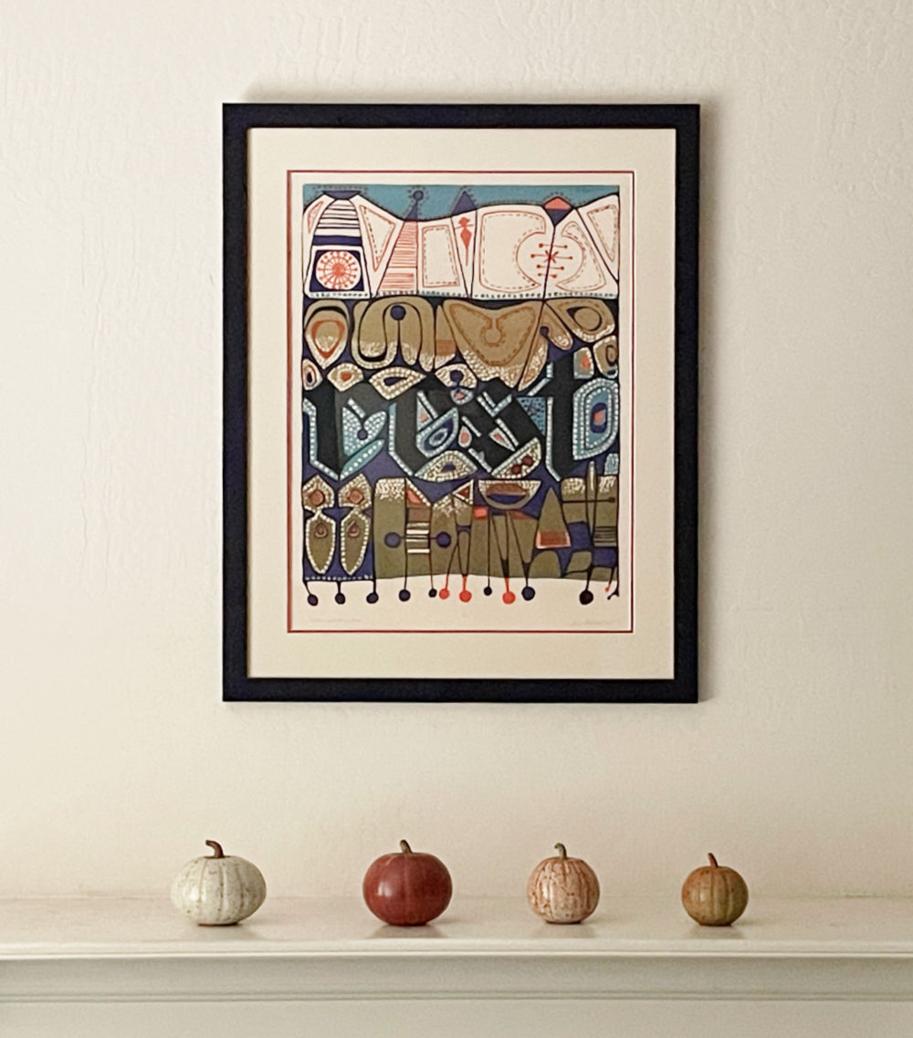 I liked the minimal effect with just the pumpkins but decided to layer in a few other fall-toned goodies. The 1800s Chinese lacquer box was a Goodwill item that turned out to rather spectacular find and the moody 1969 San Francisco painting by Dean March was a Shopgoodwill.org purchase from years ago.