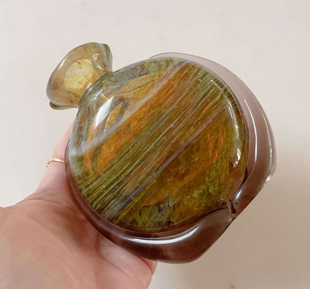 But here’s what I did buy. This thrift store blown glass vase sports a Brentano’s San Francisco sticker. Aren’t the colors just perfect for fall?? It would be great set in a window display with light streaming through it.