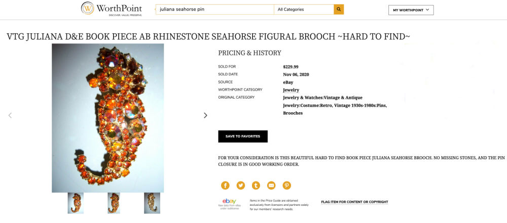 This amazing 1960s DeLizza & Elster Juliana rhinestone seahorse was made in different color combinations and three years ago one in the same fall colors as mine sold on eBay for $230.