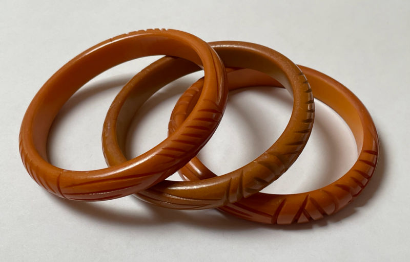Found these early on. Thought they might be carved butterscotch bakelite bangles and they are. (Tested with Simichrome.) Bakelite jewelry is not quite as hot as it was10+ years ago, but still desirable. I’ve listed these for $125.