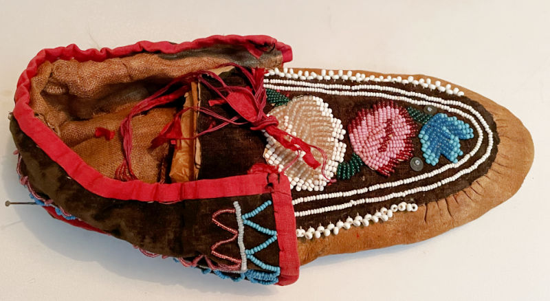 This lone child’s tourist moccasin has a bit of wear and bead loss. Not sure if it will find a new home or not!