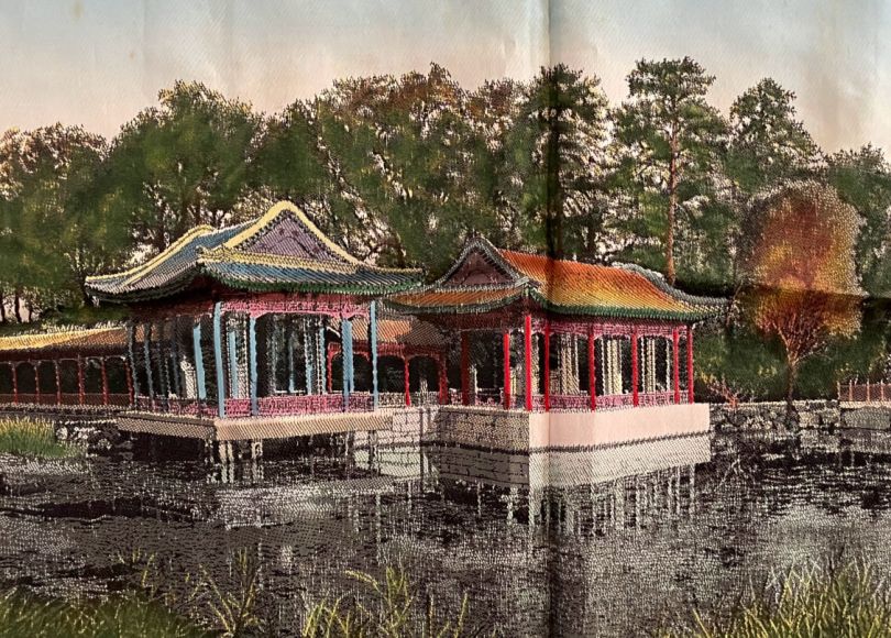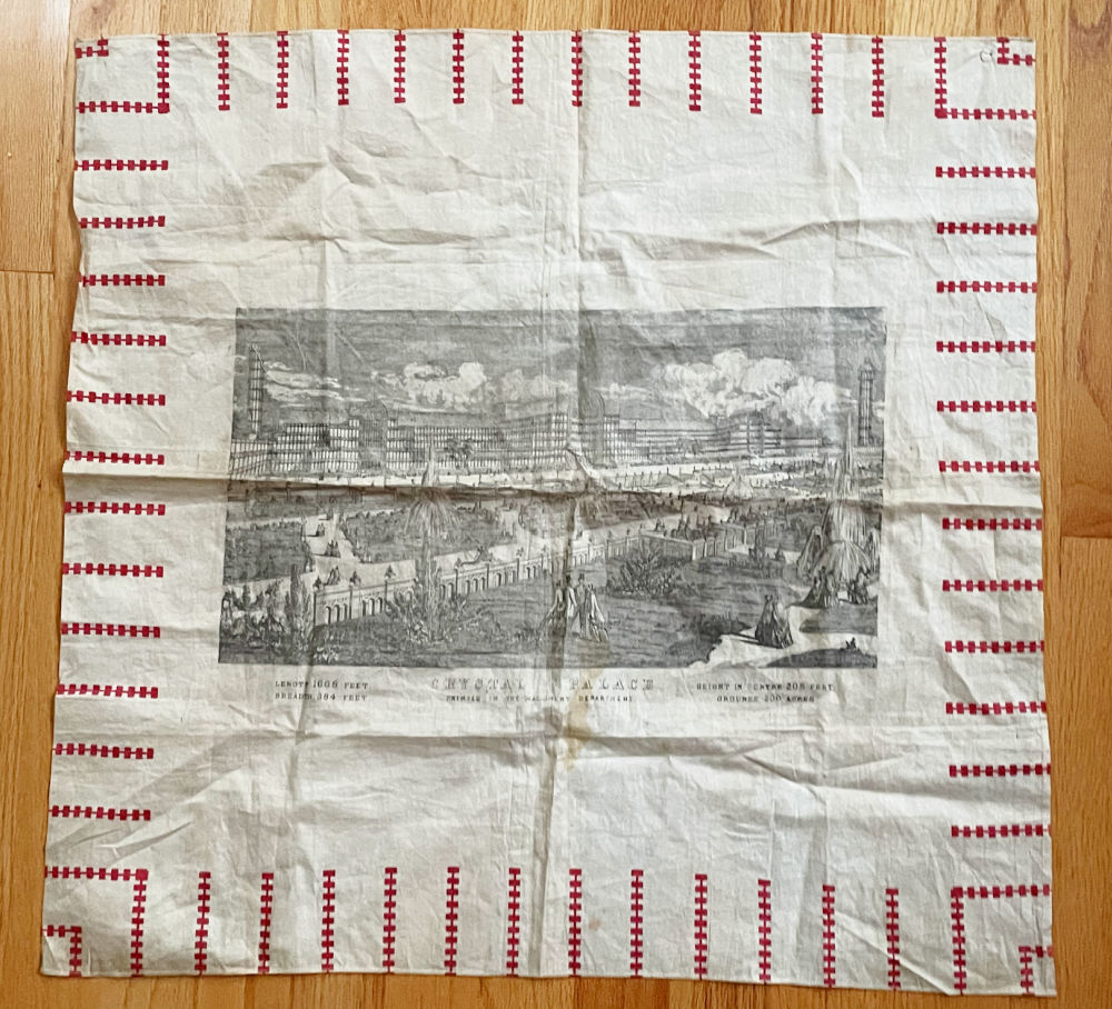 This 1800s cotton scarf is from the Crystal Palace in London. It has yellow stains and I’m debating whether to try and get them out. Well, I’ll at least give it a soak.
