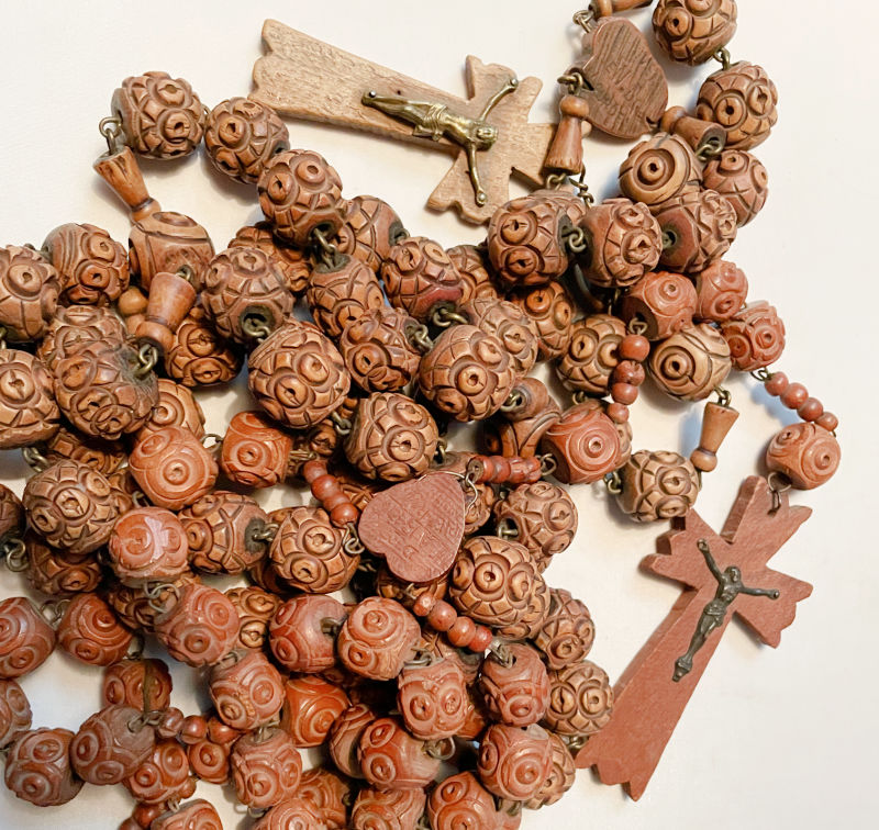 These two vintage rosaries are from France. One is stamped for Lourdes. They are huge wedding or lasso rosaries and both appear to carved wood, but I’ll need to double-check!