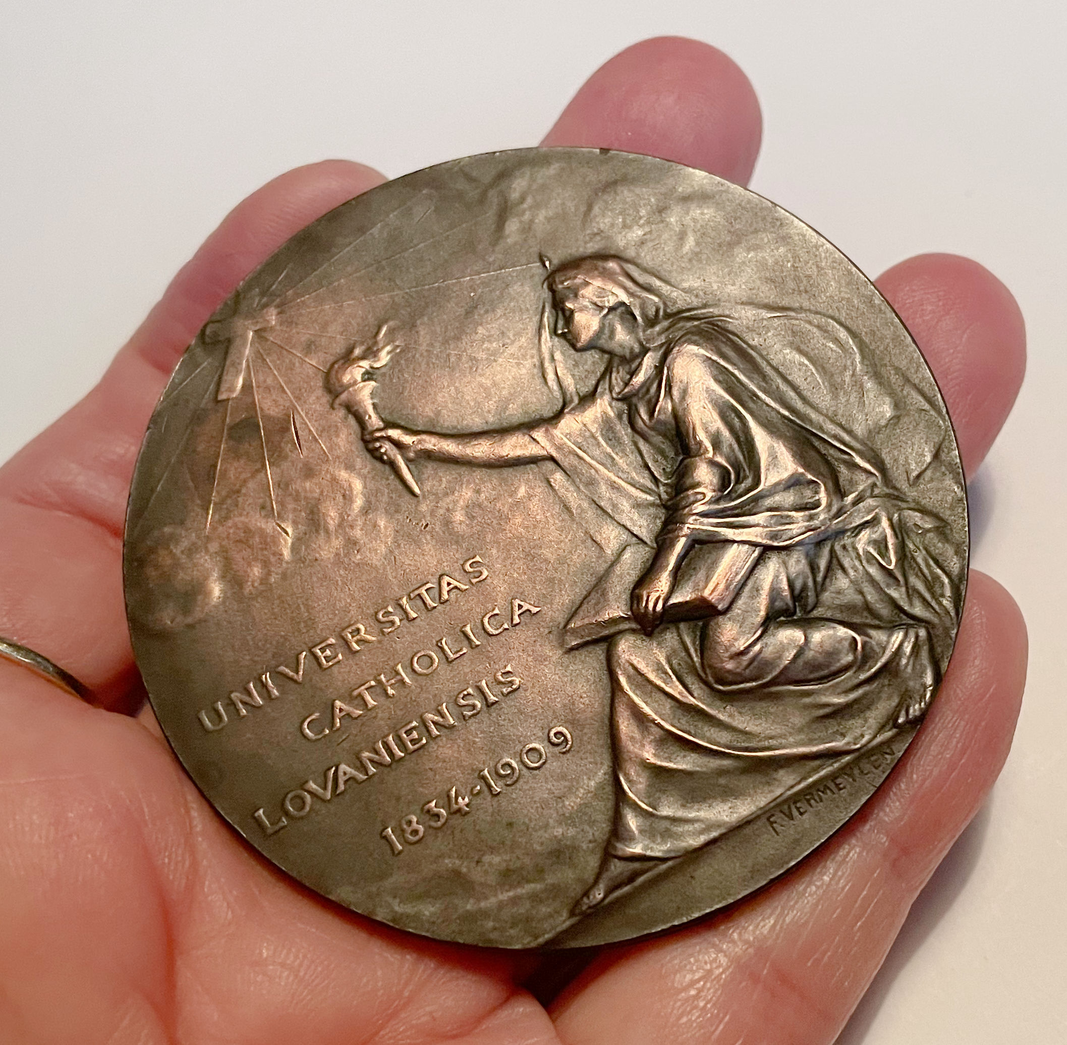 For example, this antique bronze medal is for the Catholic University of Louvain designed by Belgian sculptor Frantz Vermeylen. One sold a few years ago for $40 and one is currently listed for $139. Hmmmm.