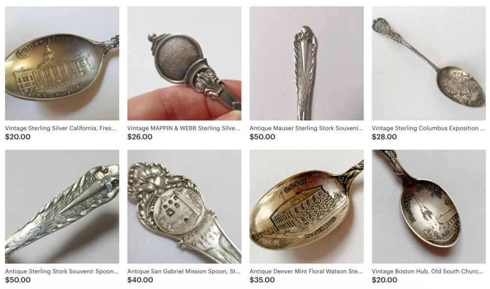 For example, I bought most of these spoons (part of my personal collection) on eBay, so I’ll see how I do selling them there! And yes, collecting antique sterling silver souvenir spoons is no longer on trend–the Golden Age of collecting them began in the 1890s and continued to 1917 or so–BUT there are still collectors today!