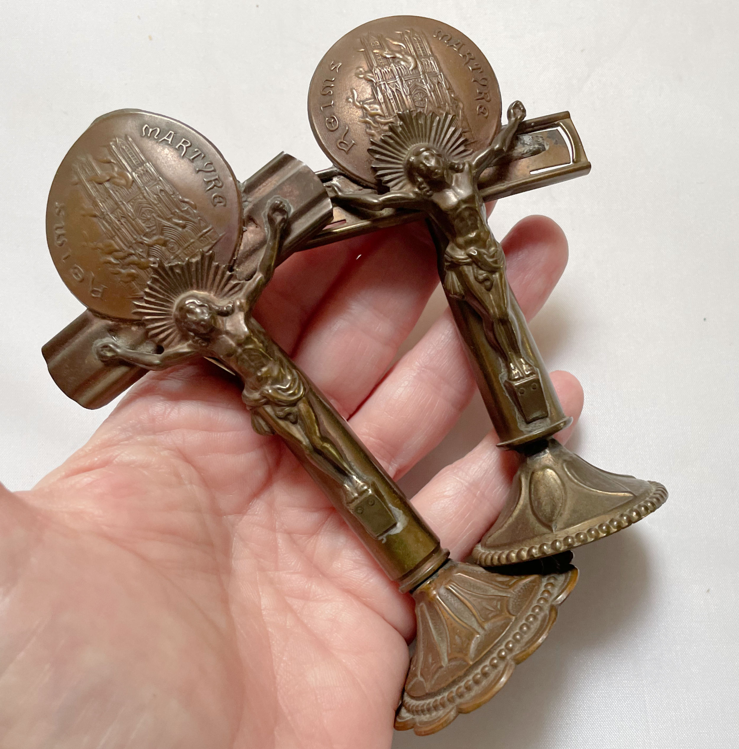 My friend at the pick pointed out to me that these were trench art pieces because of the shell casing supporting the crucifix. Well, yes and no! The shell case in the back was from the war…WWI that is, but not made in the trenches. As it turns out Reims Cathedral in France was heavily damaged in WWI and shortly after the war ended starting producing these shell crucifixes to help fund repairs. Still cool old pieces with a bit of history. Listed at $90 for the pair.