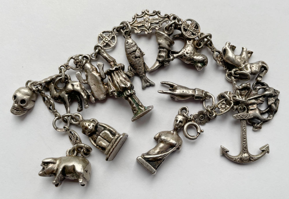 One of my favorite recent purchases is this old (circa 1890s-1920s) sterling silver charm bracelet I bought on eBay (paid $101). The charms are solid, some of bit crude/worn, some rather scarce and the bracelet itself is a thing of beauty. I haven’t researched all the charms yet, but I see a couple that could sell individually for $100.