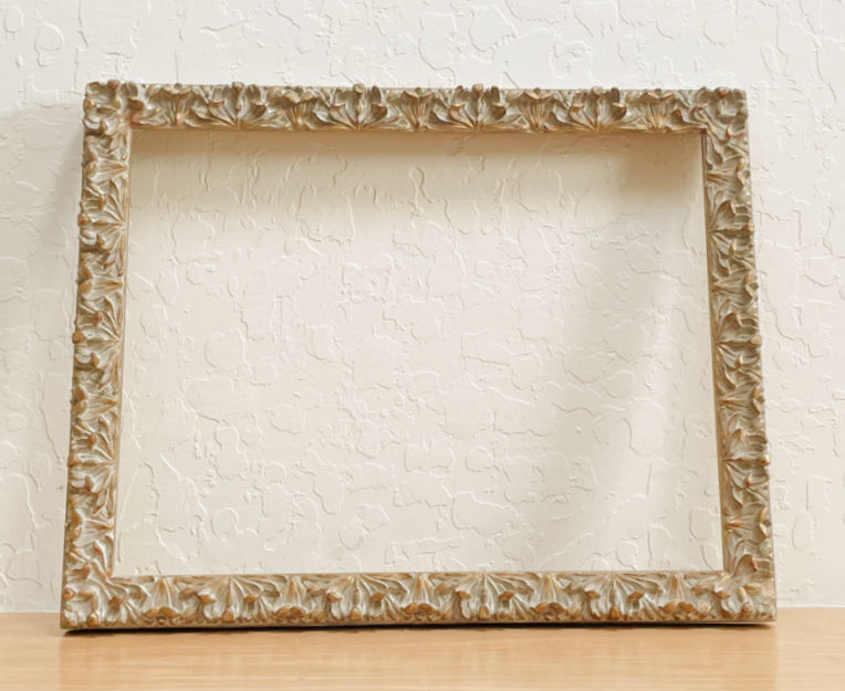 And yesterday I found this large wood and plaster gilded frame (with a worn easel back covered in velvet) at my neighborhood thrift store–vintage and likely antique. It’s a beauty with only minimal damage. (Paid $7.99).