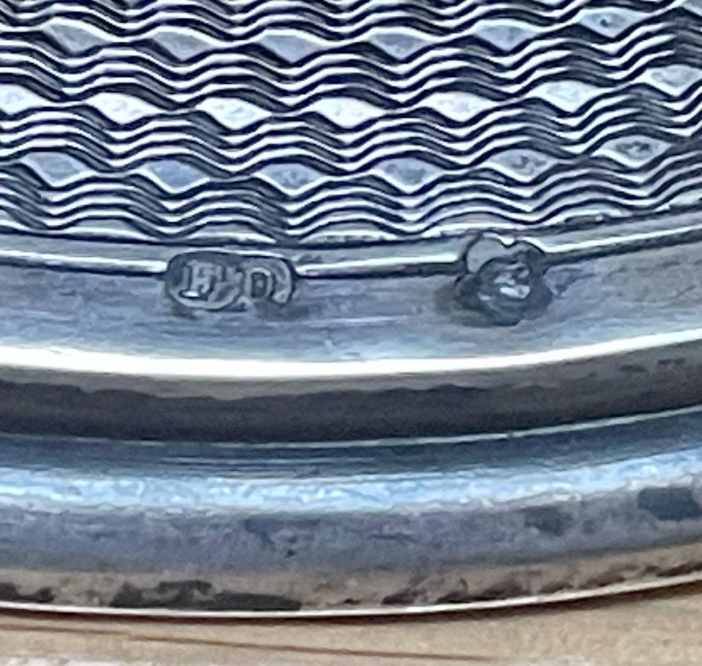 Here’s why: It was tarnished but when I picked it up but wasn’t heavy like some silver-plated items. The engine-turned engraving was finely done. It had all the signs of serious age (more on that later). But it was the tiny marks on the base, one likely a European hallmark, that drew my attention. I knew this was one to buy.
