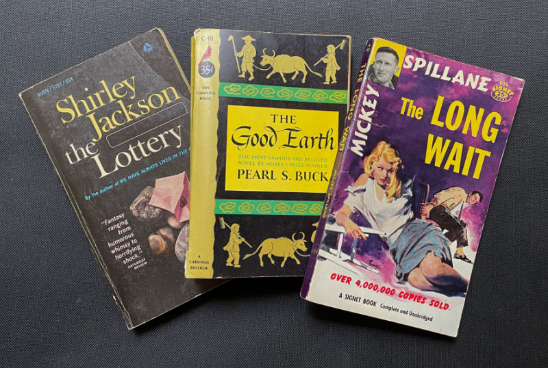 Here’s a few I bought for myself. I just started Pearl Buck’s classic “The Good Earth” and it’s a strangely fascinating read. And Shirley Jackson’s “The Lottery.” I remember reading it in high school but only as a short story. I didn’t even know it was a whole book! I’ve never read a Mickey Spillane and bought this for the lurid cover!