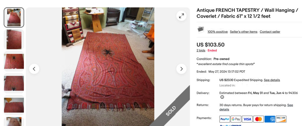 I lost out on this great piece. Here’s the story…I stumbled on this eBay listing for a huge “Antique French Tapestry” with an opening bid of $75. While it was antique, it wasn’t a French tapestry but a Scottish woven paisley and I sold a similar piece in this size for $400 last year. In great condition, this one was easily a $400-$500 piece. I placed a modest bid of $101, hoping no one else would find this listing. Someone did and outbid me in the last seconds. %#^$!