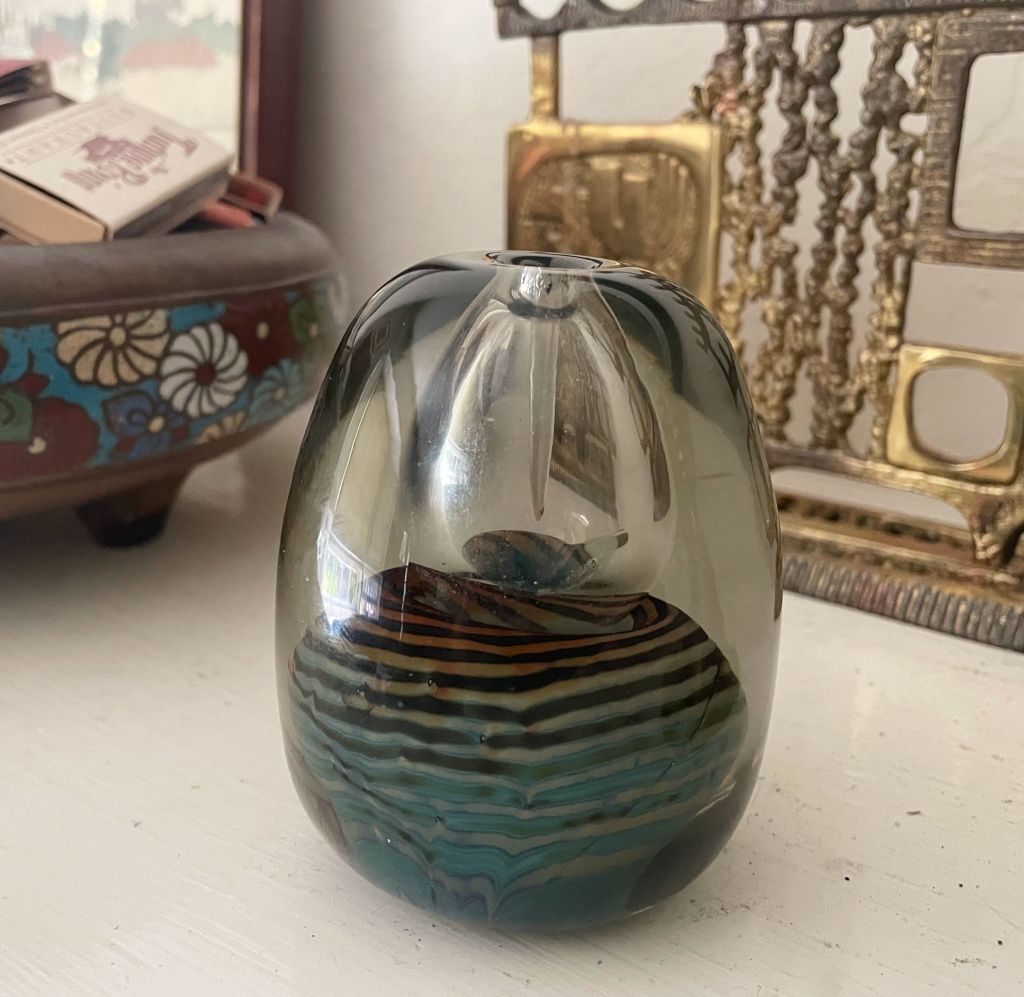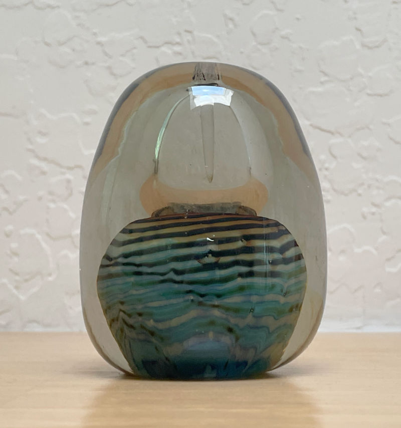 So could this paperweight be an early piece of his before he officially founded the Urrere Perkins studio? Hmmmm. Either way it’s vintage, handmade and unique. A very atypical glass paperweight for collectors.