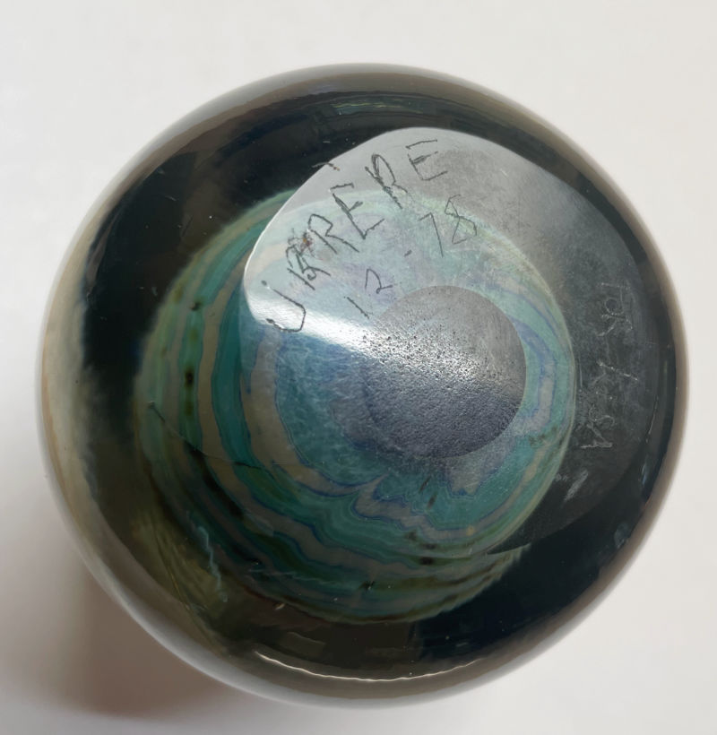 So could this paperweight be an early piece of his before he officially founded the Urrere Perkins studio? Hmmmm. Either way it’s vintage, handmade and unique. A very atypical glass paperweight for collectors.