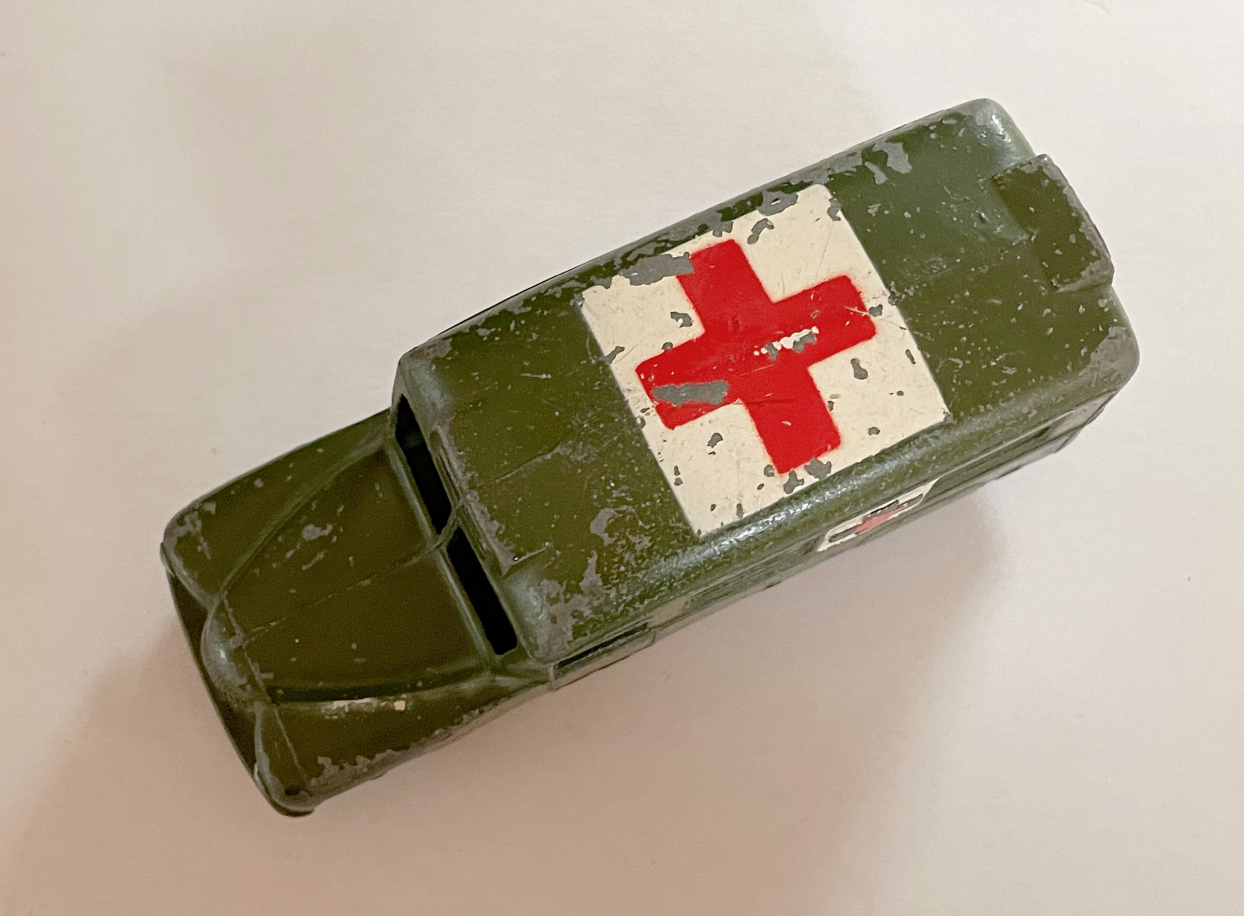 I was so excited to find one in the wild. My research indicates that this ambulance is circa 1935 to 1950s. Not valuable (and some Dinky Toys are) and it’s been well loved, but I’m still thrilled!