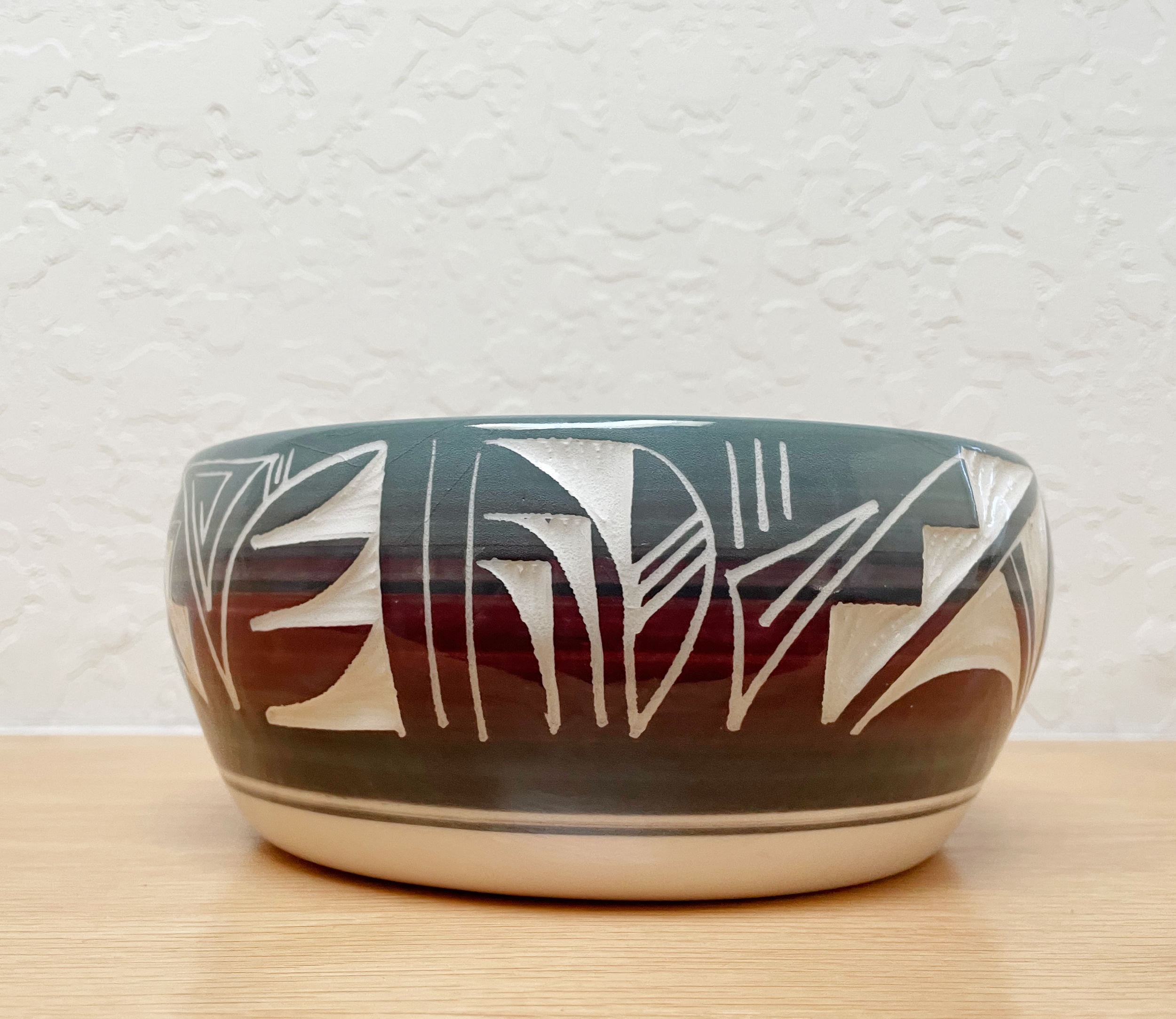 But here’s a category I often buy–Native American pottery. It consistently sells for me and I liked this graphic carved pottery bowl by Navajo artist R. Silas. Sadly crazed so no longer suitable for food, but certainly other things.